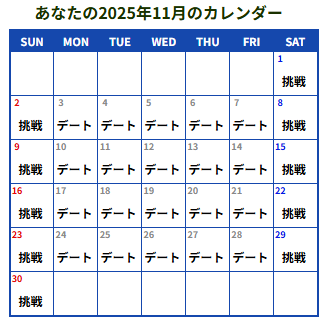 今回の2025年11月の結果は、驚くべきことに休息日が一日も存在しません。平日は愛を語らい、週末は己を高める。このストイックかつ情熱的な構成は、あなたが凡庸な日常を脱し、常に何かに「没頭」し続けている求道者であることを示唆しています。