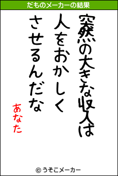 最後に添えられる「あなた」という署名。 これは、この言葉の発信者が間違いなく自分自身であることを証明しています。 しかし、今の自分に違和感があるなら、別の「あなた」を探す旅に出ましょう。 生まれ変わりメーカーで来世の自分に期待するか、整形費用メーカーで外見を変えて新しい自分になるか。 あるいは、プロフィールメーカーでプロフを書き換えて、ネット上の人格だけでも理想に近づける。 どんな自分になっても、あなたはあなた、だもの。