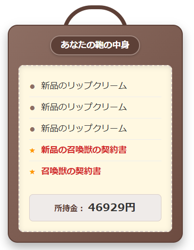 今回の結果は、「リップクリーム」という極めて現実的な必需品と、「召喚獣の契約書」というファンタジックな超常アイテムが同居するという、あなたの「二面性」を強く示唆しています。