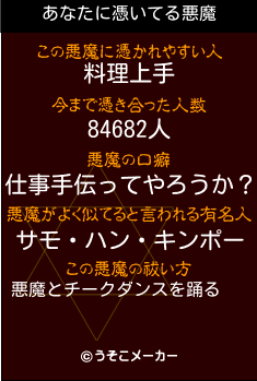 まず、憑いている悪魔の危険度を判定しましょう。 「仕事手伝ってやろうか?」という口癖の悪魔は、過労のサインかもしれません。 もし、もっと凶悪な、例えば金銭を要求するような悪魔だった場合は、詐欺メーカーで自身の防犯意識を高めるか、警告メーカーで現在発令されているトラブル予報を確認する必要があります。 また、悪魔の顔が「サモ・ハン・キンポー」のような武闘派俳優に似ている場合、物理的な攻撃を仕掛けてくる可能性があります。つよさメーカーで自身の戦闘力を確認し、勝てる見込みがないなら逃げましょう。