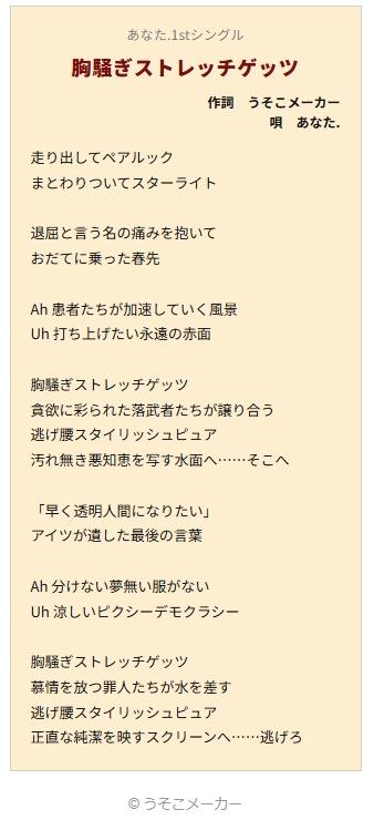 ってことでこのメーカーは名前を入れるとデビュー曲の歌詞が表示されます。