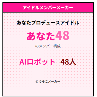 アイドルグループは、様々な個性が集まって初めて完成します。 うそこ大学・芸能プロデュース学部が提供する『アイドルメンバーメーカー』は、あなたの名前をリーダーとして、世界中から集められた最高の才能(と、ちょっと変わった個性)を持つ仲間たちと、夢のグループを結成するシミュレーションツールです。