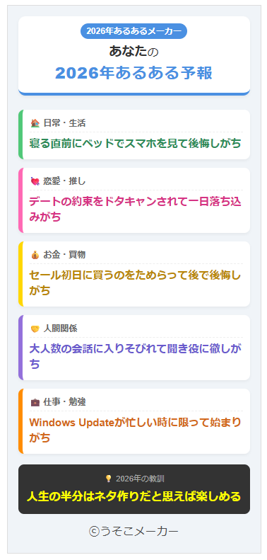 名前を入れると、あなたの2026年に起こりそうな「ありがち日常」を、ジャンル別にゆるく予報してくれるメーカーです。