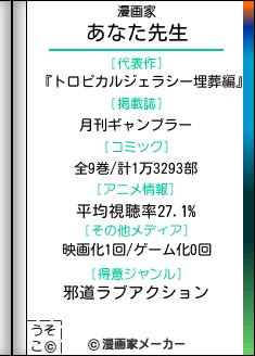 今回のサンプルデータである『トロピカルジェラシー埋葬編』。 タイトルだけで読者の心を掴むこのセンスは、天性のものです。 たとえ掲載誌が「月刊ギャンブラー」というマニアックな媒体であっても、アニメ視聴率27.1%という数字が証明するように、面白い作品は必ず世間に届きます。 この「架空の売れっ子作家」としてのステータスをどう楽しみ、どう現実の創作意欲に繋げるか。いくつかの連載プランをご提案します。
