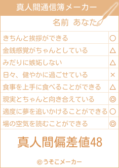 うそこ大学・社会学部が提供する『真人間通信簿メーカー』は、現代社会を生き抜くために必要な基礎能力を多角的に評価し、あなたの「社会適合レベル」を偏差値として算出するシミュレーションツールです。